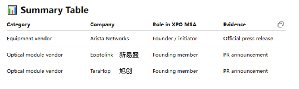 Ответ: Основные преимущества корпуса XPO заключаются в революционной плотности размещения, а также в решении проблем с теплоотводом и стоимостью модулей; Технические преимущества включают в себя возможность замены 8 модулей OSFP одним модулем XPO, использование технологий охлаждения с помощью холодных пластин и жидкостного охлаждения для продления срока службы съемных решений, а также встроенный чип DSP, значительно повышающий стоимость и объем продаж продукта. Пропускная способность достигает 6,4 Тбит/с с возможностью будущего расширения до 12,8 Тбит/с, а коммутационная емкость 16 модулей XPO в 1U может достигать 102,4 Тбит/с; Что касается отраслевой структуры, Arista является инициатором XPO MSA, а многие ведущие производители оптических модулей, такие как NewEase, Xingtu, Finisar, Solstice и Foxconn, выпустили модули в корпусах XPO MSA; Finisar и Solstice также представили конкретные продукты XPO с пропускной способностью 3,2 Тбит/с и 6,4 Тбит/с/12,8 Тбит/с соответственно.