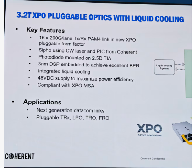 В будущем возможна модернизация до 12,8 Тбит/с (8×1600G); встроенный чип DSP значительно повышает стоимость и объем продаж продукта; использование технологий охлаждения с помощью холодных пластин и жидкостного охлаждения продлевает срок службы съемных оптических модулей; Arista выступила инициатором, а NewEase, Xlite, Finisar, Solstice, Foxconn и другие компании выпустили модули в корпусах XPO MSA; Finisar представила 3,2T XPO, а Solstice — 6,4T/12,8T XPO.