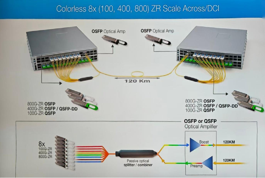 5.1 Сфера межцентровых соединений (DCI): ARISTA демонстрирует линейку продуктов для межцентровых соединений, (1) включая усилители OSFP EDFA, когерентные оптические модули 800G OSFP, с использованием сплиттера для агрегирования DWDM-длин волн; на принимающей стороне когерентный оптический модуль самостоятельно выбирает DWDM-длину волны на входе RX; вся система не требует пассивного DWDM-мультиплексора/демультиплексора; предназначена для межсетевых соединений на расстоянии 120 км (не подходит для передачи на большие расстояния, поскольку качество OSNR при таком подходе очень низкое).