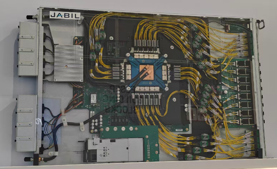Рис. 8. Фотография коммутатора JABIL NPO, в котором используется 16 модулей NPO емкостью 6,4 Тб, произведенных компанией Marvell; коммутатор формата 1U с пропускной способностью 102,4 Тб, охлаждаемый с помощью традиционной технологии «холодных пластин».