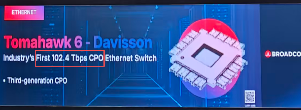 Рис. 9. Интегрированное решение Broadcom 102.4 T CPO: пропускная способность одного «модуля оптического движка» составляет 6,4 Тбит/с; вокруг ASIC расположено 16 модулей оптического движка